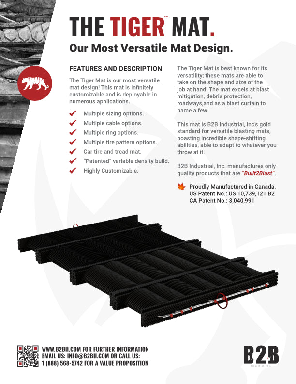 The Tiger Mat is best known for its versatility; these mats are able to take on the shape and size of the job at hand! The mat excels at blast mitigation, debris protection, roadways, and as a blast curtain to name a few. This mat is B2B Industrial, Inc’s gold standard for versatile blasting mats, boasting incredible shape-shifting abilities, able to adapt to whatever you throw at it.